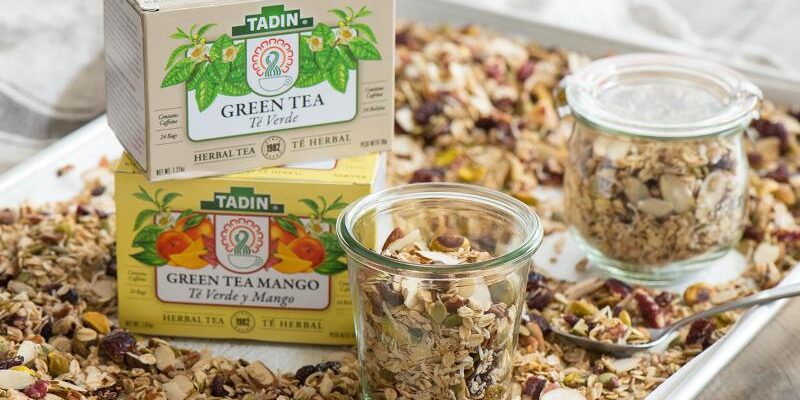 Note: To prepare the tea for this recipe, steep and cover 3 tea bags of Tadin Green Tea Mango (or Tadin Green Tea) into 1/2 cup of hot water for 2-3 minutes. Let it cool to room temperature.