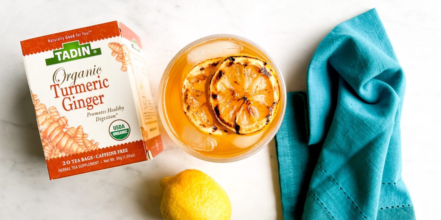 This refreshing iced tea cocktail is made with Tadin Organic Ginger Turmeric. It’s perfectly satisfying on a hot summer day. If you are grilling, simply put the lemon slices right on the grill to add decadent depth of flavor to your drink. Feel free to skip the shot of rum if you’re avoiding alcohol. Salud amigas y amigos! Recipe below created by the talented @chefcarla_c